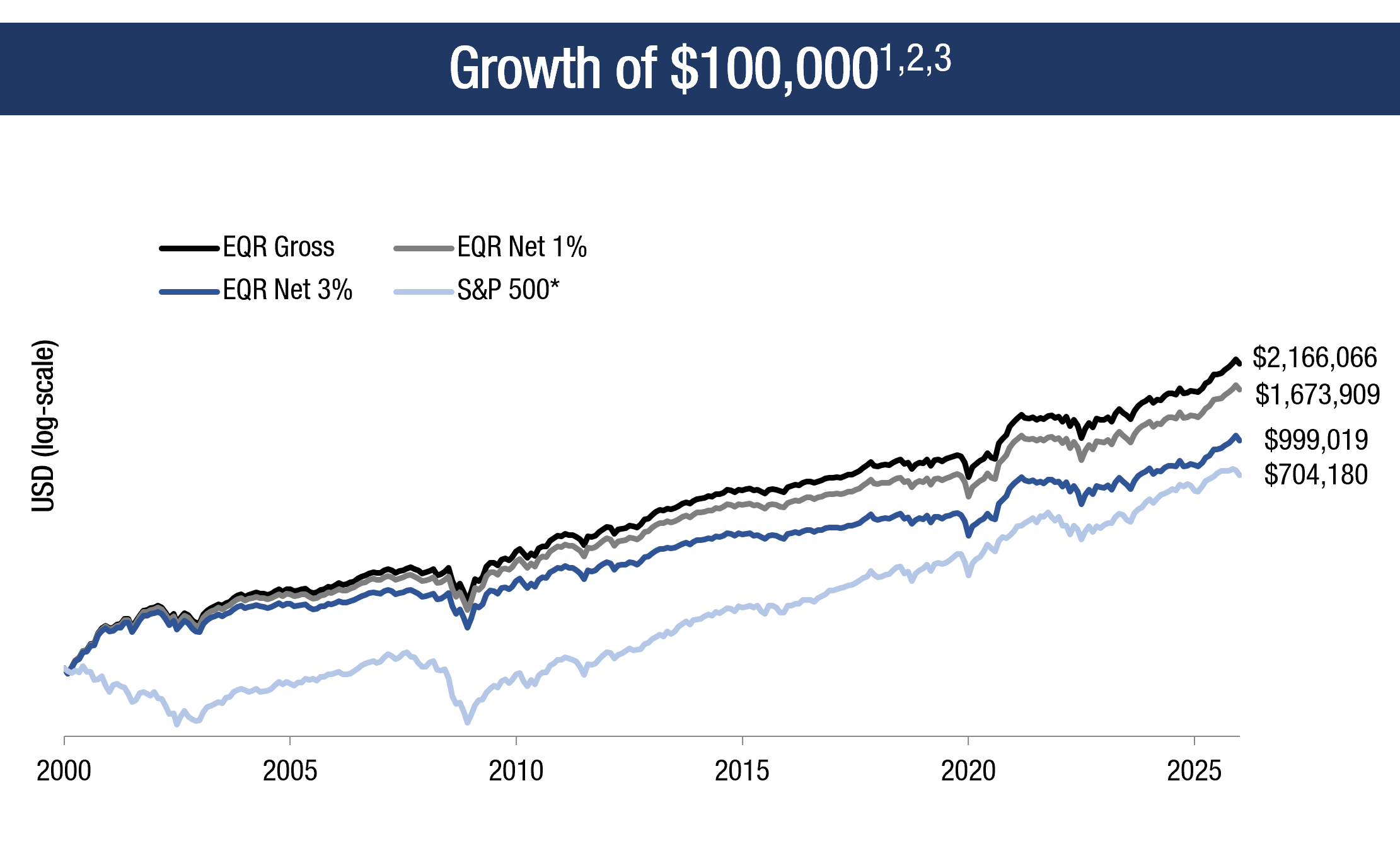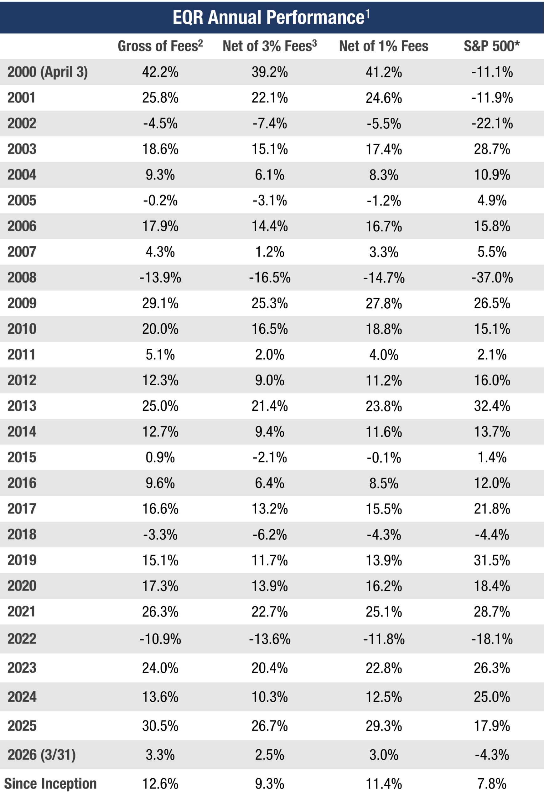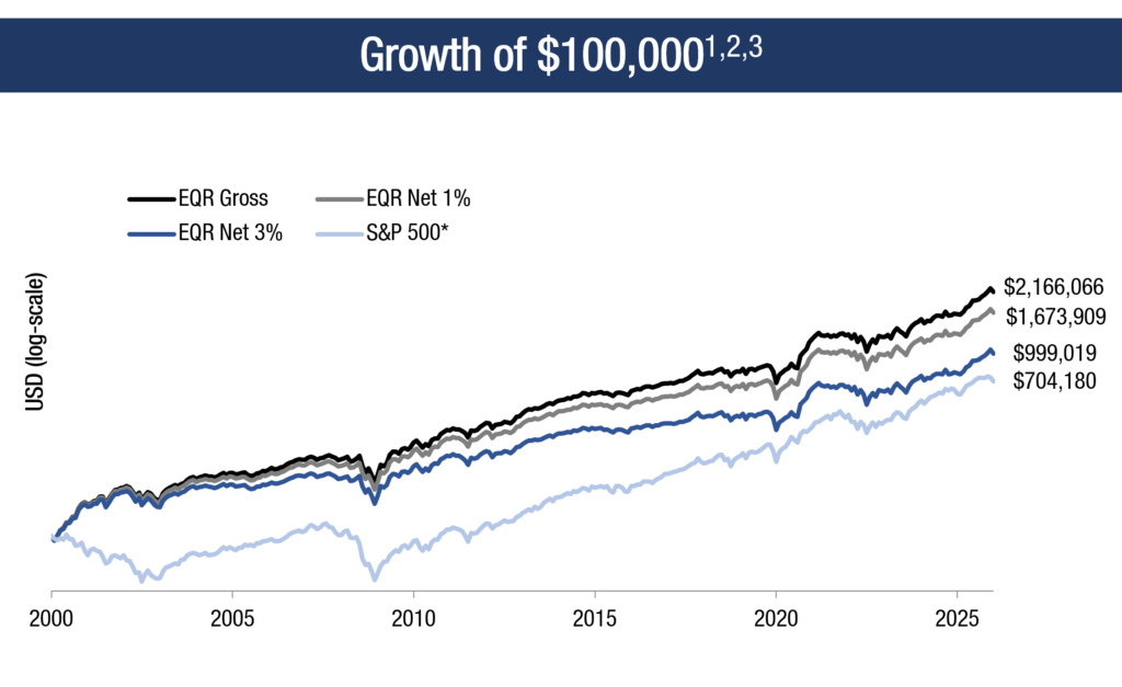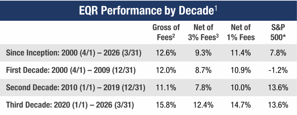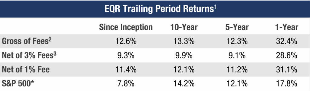 3Net returns are the EQR Total Accounts composite pure gross returns reduced by the highest wrap fee as required under GIPS; 3% is the highest tier fee under graduated fee schedules for smaller asset levels at some partner firms. Most ACR partners charge significantly less than 3%.